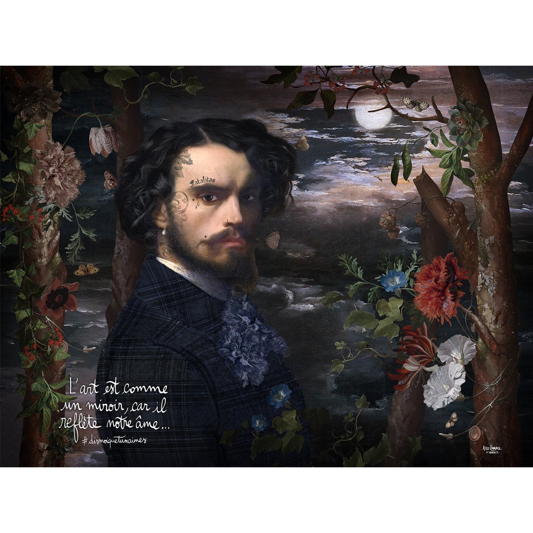 J’apprends rapidement en lisant qu’Alexandre Cabanel (que je ne connaissais pas à l’époque) y est enterré depuis 1889. Je cherche donc sa peinture sur internet et évidemment je tombe amoureuse de son style académique, parfaitement réaliste à mes yeux. Quelques jours plus tard j’étais au musée Fabre pour découvrir en vrai la collection permanente de ce peintre dont déjà j’étais dingue. Et dans un couloir de la galerie je tombe nez à nez avec cet autoportrait. Juste à hauteur de mes yeux, ce petit tableau semblait être le vrai reflet de son visage, juste devant le mien. Évidemment des larmes ont rempli mes yeux face à cette première rencontre pseudo physique avec Alexandre. Son regard si sombre semblant percer le mien, cette allure, ses cheveux, sa barbe… Tout me plaisait. Comme un coup de foudre avec un fantôme. Pas évident à retranscrire vous imaginez bien.