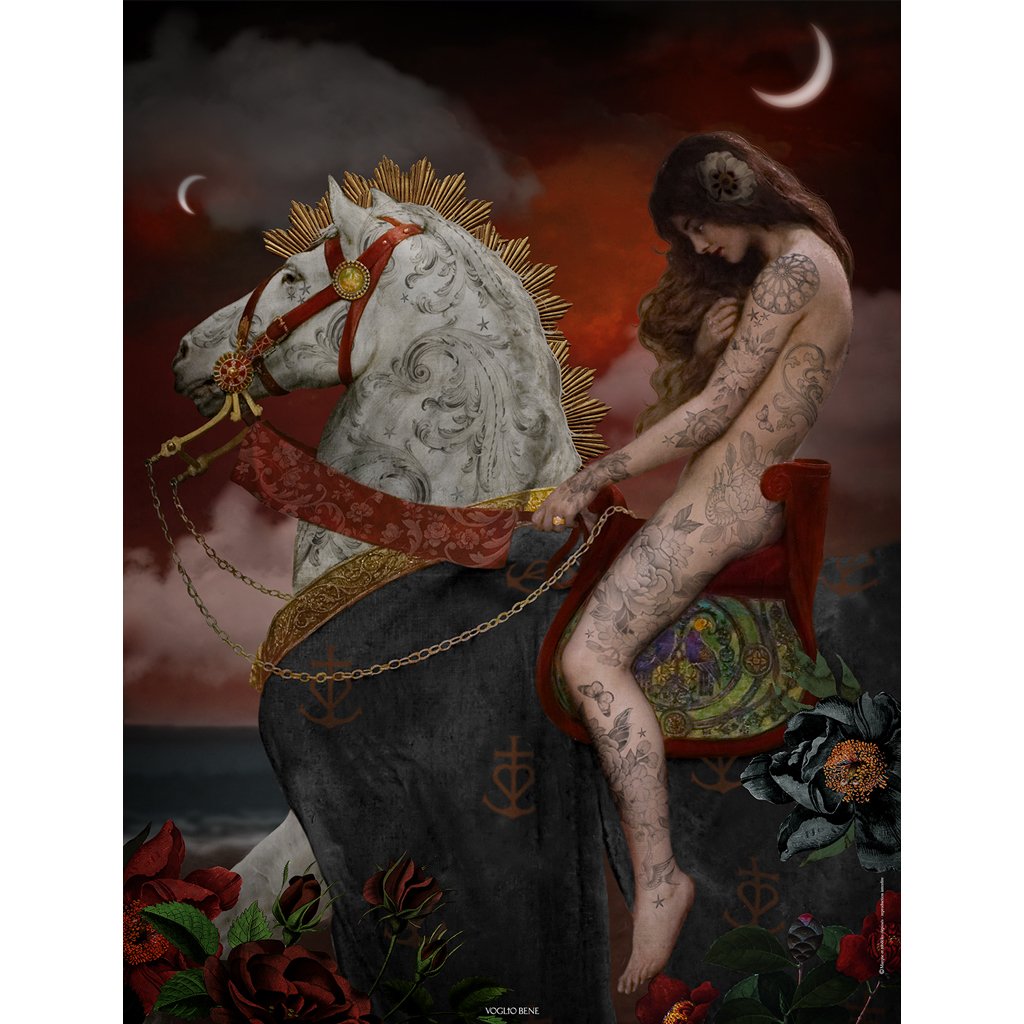 Quoi qu’il en soit j’ai vu en ce tableau un magnifique potentiel, la beauté de cette femme et de son cheval m’ont immédiatement séduite pour ma collection bohémienne. Le cheval a été transformé en Roi Camarguais, fier et flamboyant, et la belle Lady a été tatouée, maquillée et restaurée.
