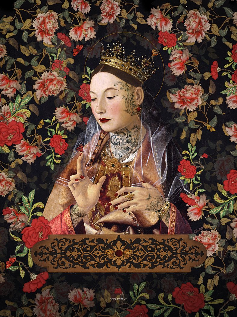 Je suis complètement fanatique de ce tableau. J’adore le fait qu’elle n’ai pas de cheveux autour de l’oreille. Ça lui donne un côté super rock. Et ses yeux, comme bridés m’ont donné envie de «chinoiser» l’histoire. C’est pourquoi j’ai accentué son regard asiatique avec un trait d’eye liner et traité l’arrière-plan à la manière d’une marqueterie chinoise.