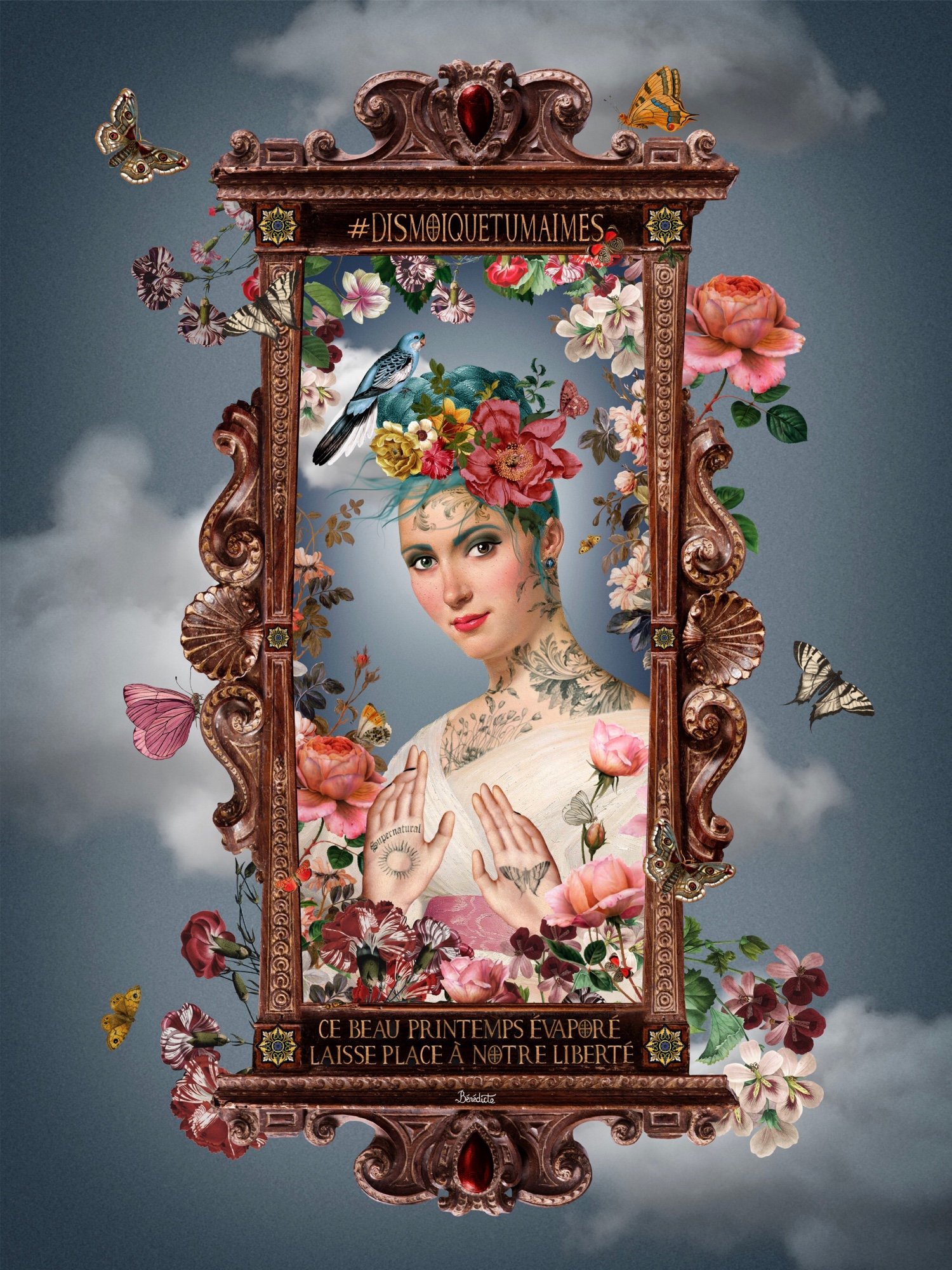 «Ce beau printemps évaporé laisse place à notre liberté». Après cette longue période d’isolement, le premier confinement, j’avais envie de fêter le printemps en décorant à nouveau un mur de mon quartier. Ce qui m’a plu sur ce tableau c’est la coiffure de la jeune femme. Je me suis dit qu’elle a du avoir mal au crâne quand elle a défait son chignon… Les cheveux sont tellement tirés ! En même temps je l’ai trouvée hyper moderne et rock n’ roll coiffée comme ça. Alors j’ai décidé de m’occuper d’elle et d’en faire une allégorie sexy et tatouée du printemps.