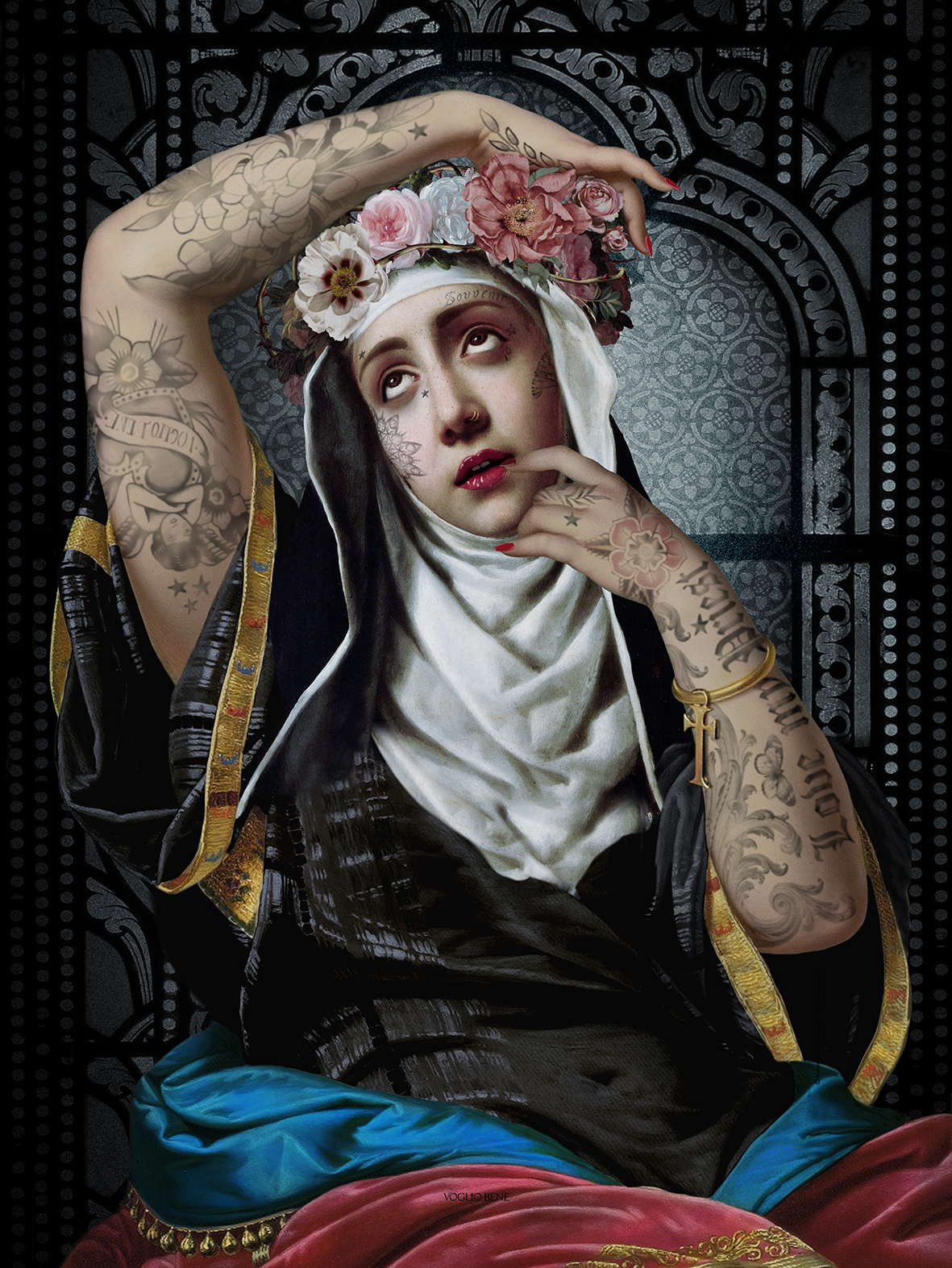 Je suis donc partie en quête d’un corps pour elle. J’ai fouiné dans mes bibliothèques virtuelles et j’ai trouvé dans mes précieux tableaux féminins, the perfect body. Tatouages et bracelet Voglio Bene, attitude lassive et sexy avec un doigt sur sa lèvre entrouverte, elle pense à son curé dont elle est amoureuse. Clin d’oeil à la première nonne que j’ai réalisée en sept 2017, au travers du tatouage qu’elle porte sur son bras gauche.