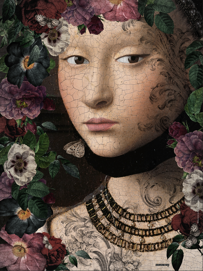 Les craquelures sont pour moi ce qui sublime le tableau, tous les éléments que j’ai apporté à celui-ci ont aussi été craquelés de la même manière car il était inconcevable d’y coller des éléments nets ne respectant pas cette magnifique usure depuis 1470. J’ai redressé son petit oeil incliné juste parce que j’avais envie de la rendre un peu plus symétrique. Fleurs, papillons et teintes relativement inédites dans mon boulot pour un rendu poétique et automnal.