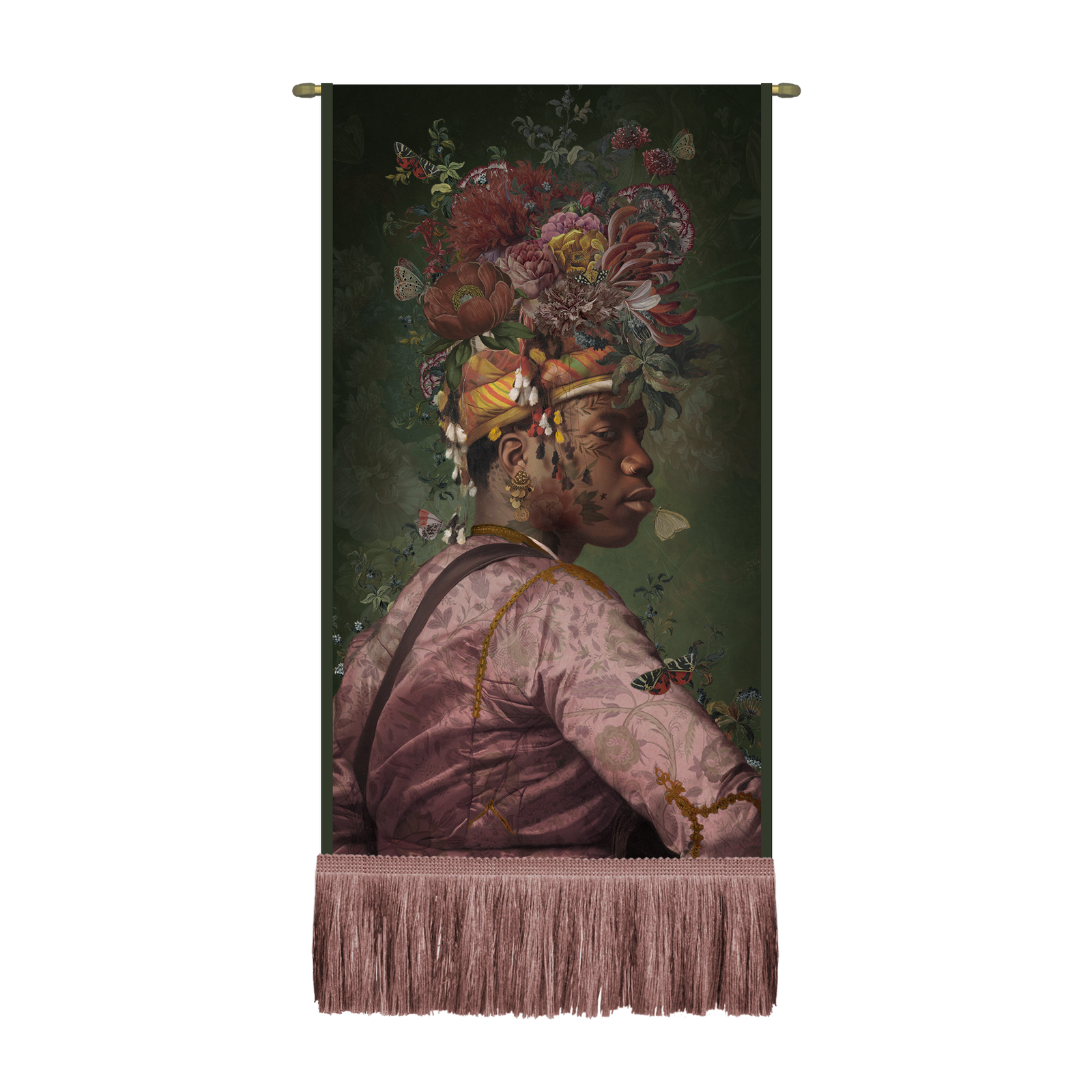 Mini tenture étendards format 37,5X72, imprimée sur velours de polyester. Haute definition d’impression. Confectionné avec un ourlet passe tringle et franges longues en bas. Biais de couleur coté gauche et droit.