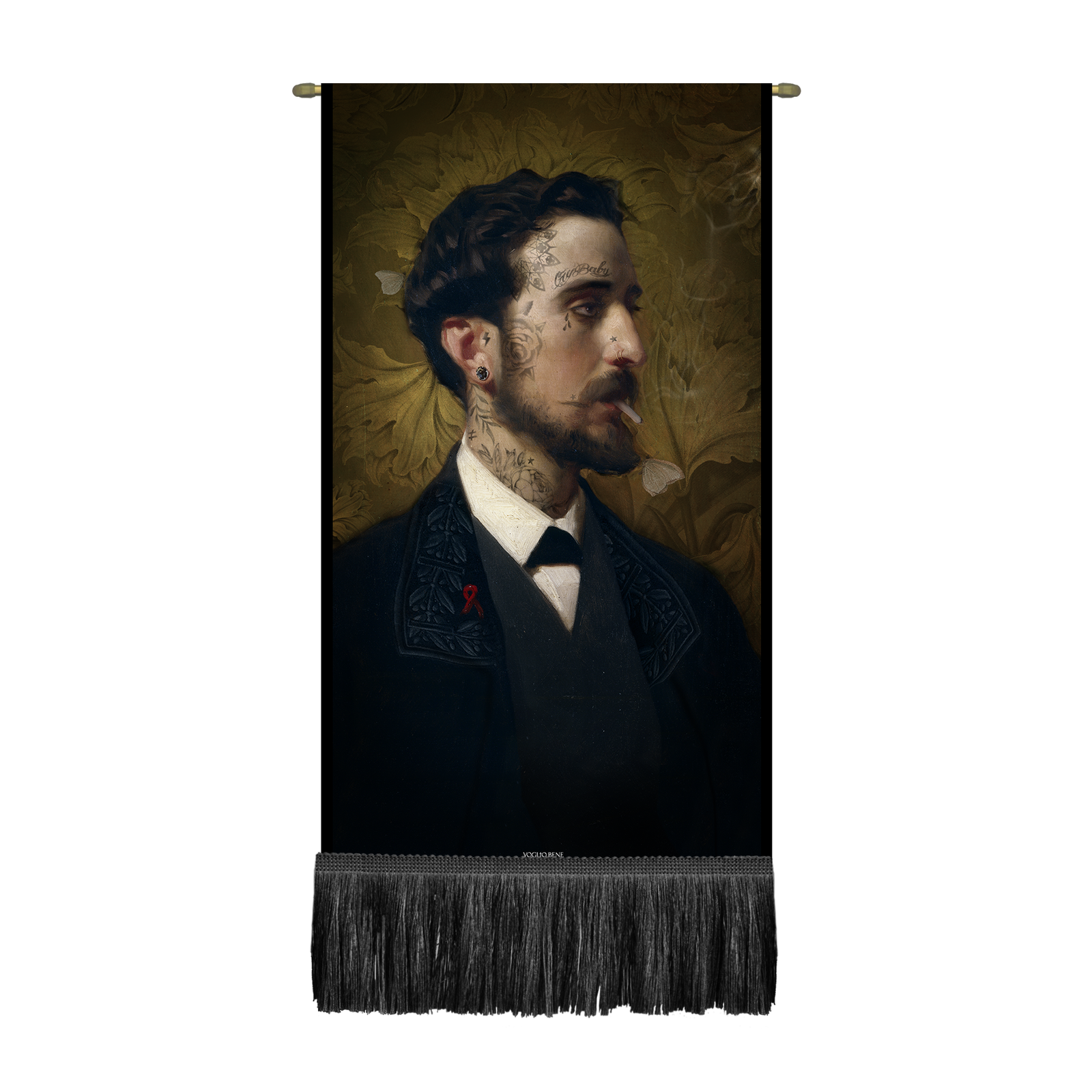 Mini tenture étendards format 37,5X72, imprimée sur velours de polyester. Haute definition d’impression. Confectionné avec un ourlet passe tringle et franges longues en bas. Biais de couleur coté gauche et droit.